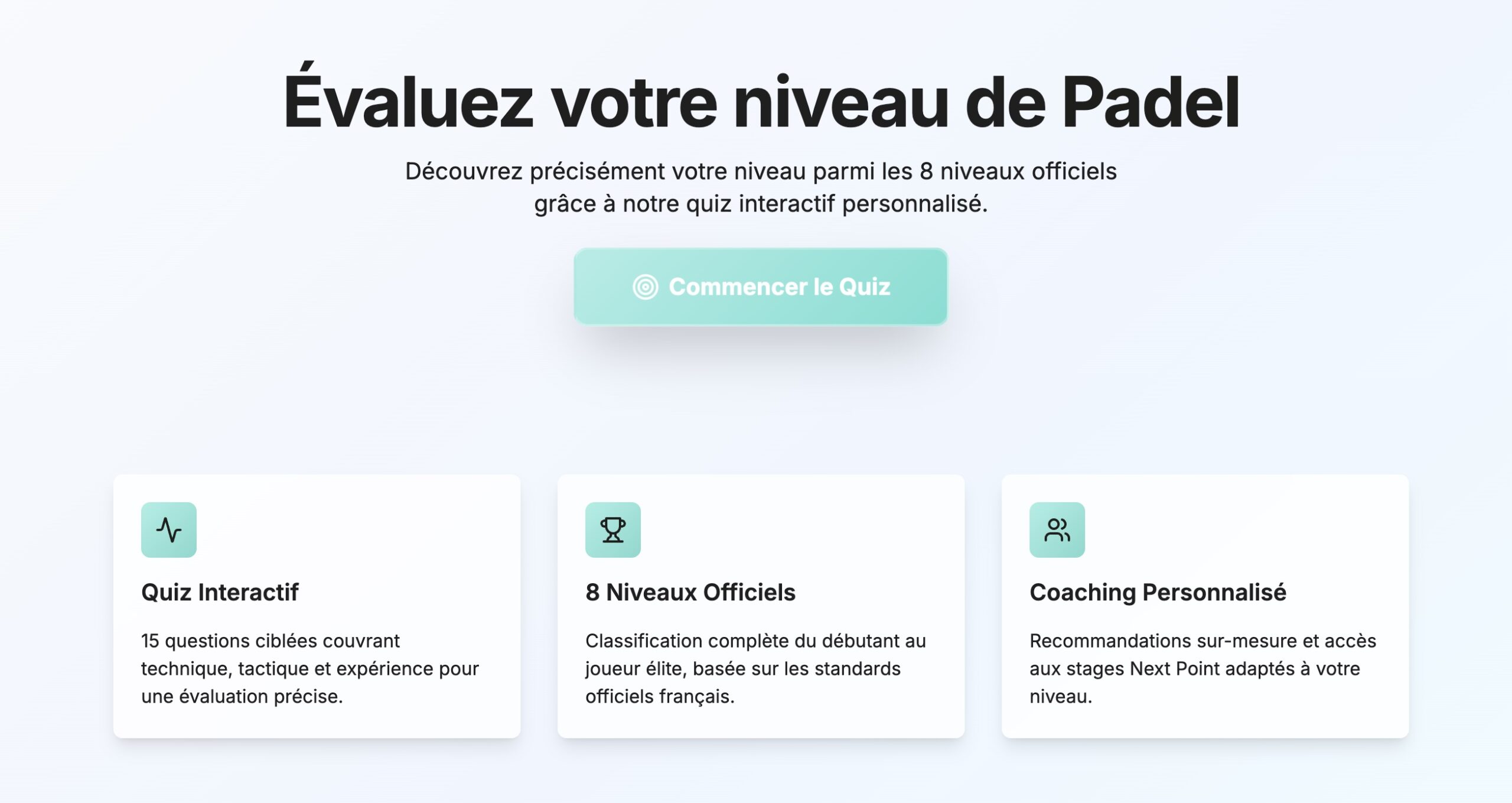 Rendez-vous sur https://niveau.nextpoint-padel.com/ et découvrez en 3 minutes où vous vous situez parmi les 8 niveaux officiels. Votre progression commence maintenant ! 🎾