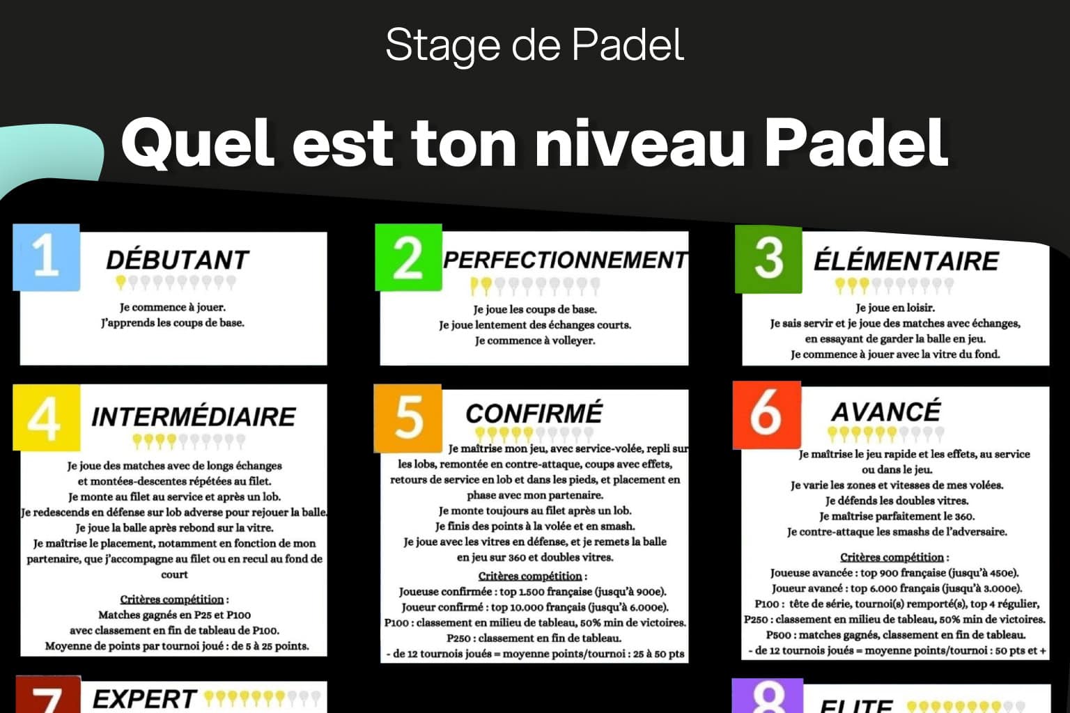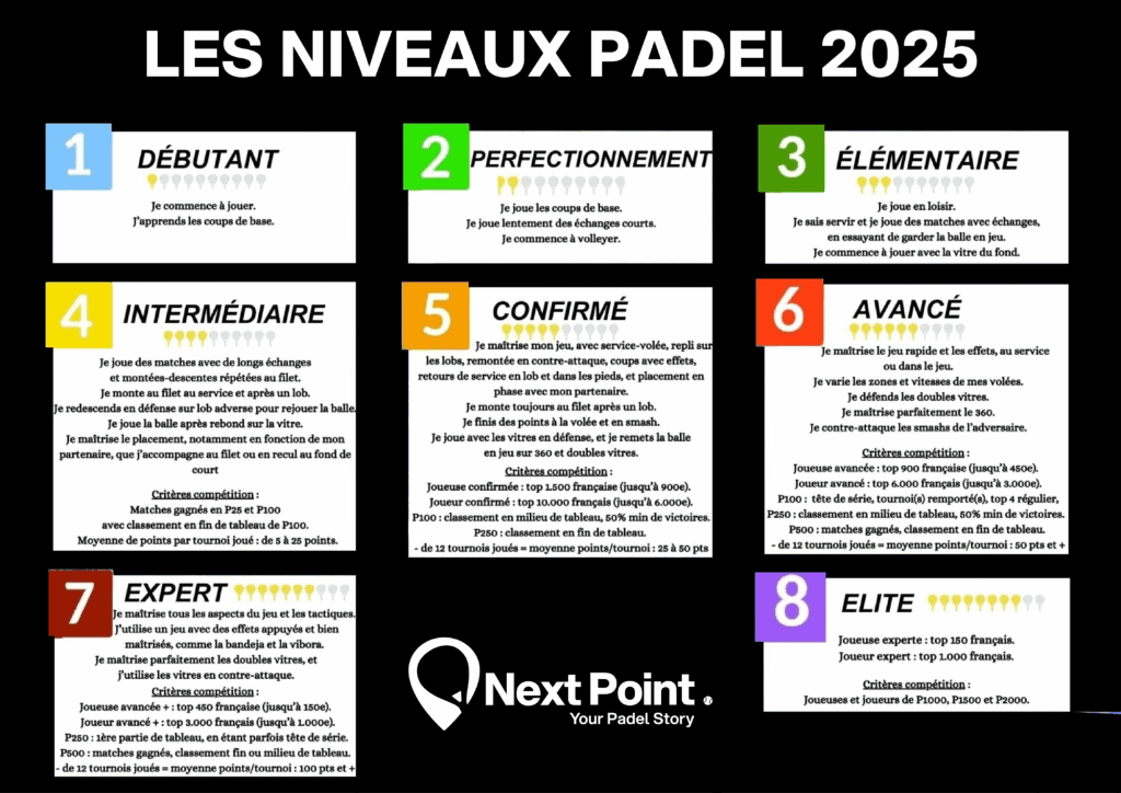 Astuce : si vous hésitez entre deux niveaux, placez-vous toujours au plus bas des deux ou demandez une évaluation à votre coach Next Point lors de votre prochain stage de padel. Vous progresserez vite, sans frustration.